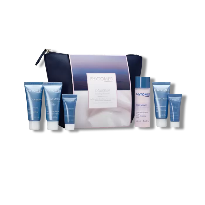 Soothe your complexion and keep skin comfortable with this soothing skin care kit that contains 4 travel-sized skin care products and 2 samples, packaged in a signature PHYTOMER travel bag.