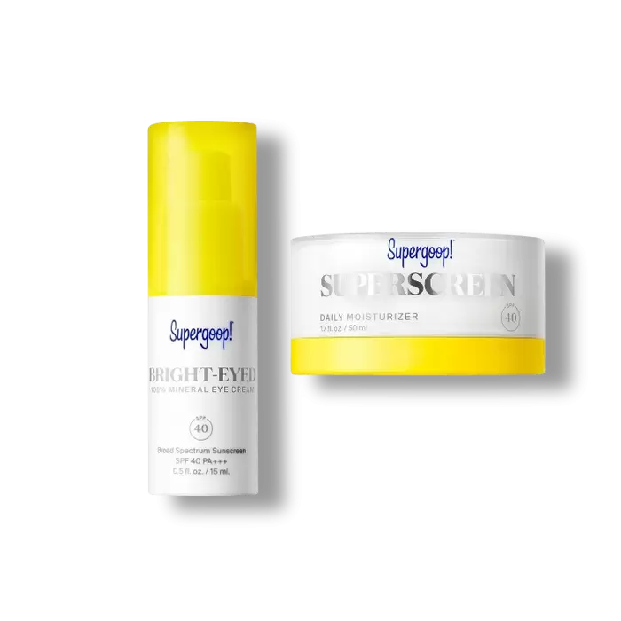 Better together. This everyday moisturizing set helps shield skin from the sun’s UV rays. First, apply Superscreen Daily Moisturizer, a lightweight formula that intensely hydrates and helps protect skin. Next, gently dab Bright-Eyed 100% Mineral Eye Cream SPF 40 around the eyes to illuminate.